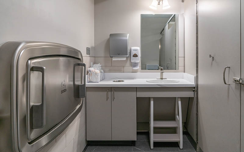 At The Rockwell, accessible restrooms are located on the mezzanine level, including a caregiver and gender-neutral restroom with an adult-sized, universal changing station. Restrooms at the Art Lab are on the same level as the main activities.