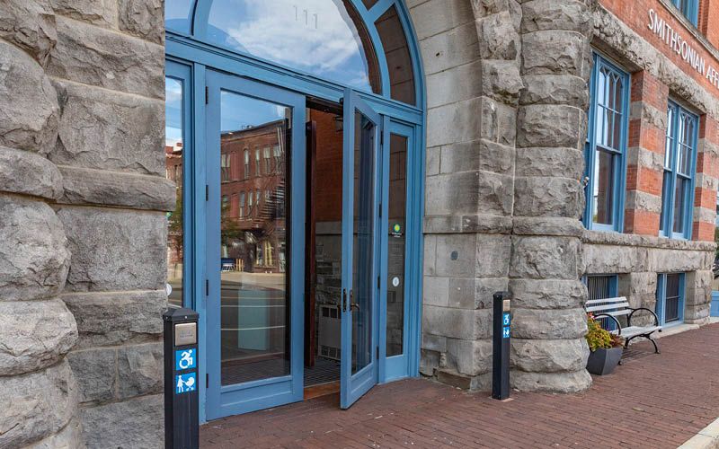 Museum and Art Lab entrances are wheelchair and stroller accessible. At the Museum, the galleries and outdoor terrace are accessible and can be reached by elevator. The Art Lab has a short, steep incline at the front entrance. Many doors, including the Museum’s main entrance and restrooms, have power-assist functionality.