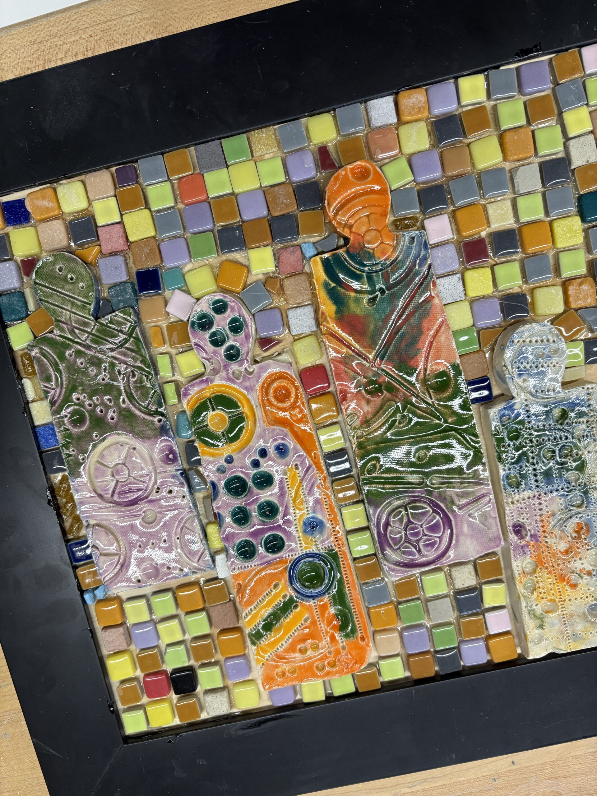 Students observed how color played an important role in expressing emotion and energy. They first designed a collaborative mixed-media collage using various painting techniques, experimenting with contrasting lines and repeating patterns to form their own dynamic compositions. This collage was then translated into a ceramic mosaic. Students used stamps and other materials to create texture on clay slabs and glazed their works with bold colors. After firing, the ceramics were combined with tiles to create a unified design that reflects both Hardin’s influence and the students’ own creativity.