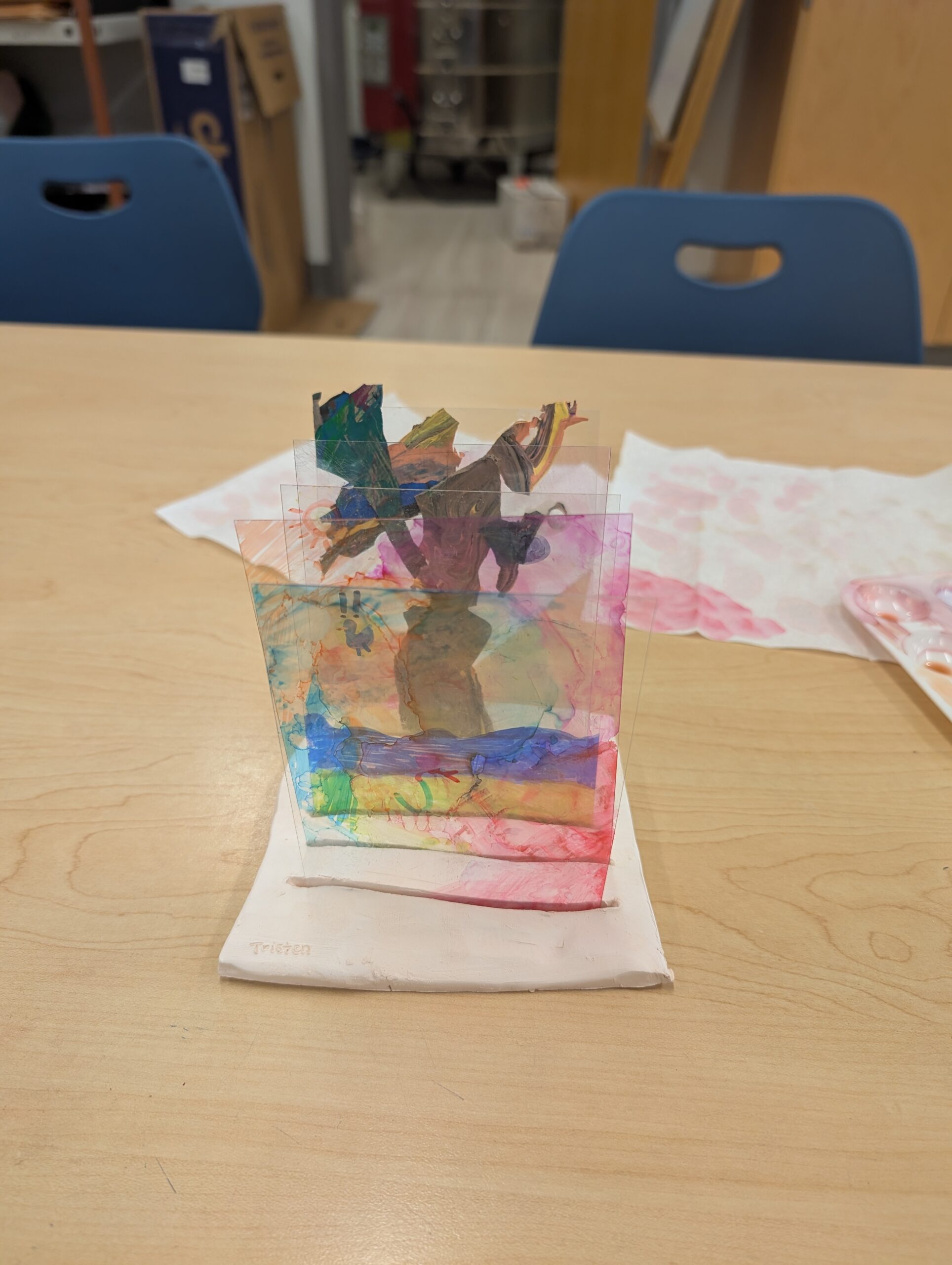 Ms. Riina’s second class drew inspiration from artist Robert Rauschenberg’s sculpture Opal Gospel (1971, on view in a gallery on the third floor). Students began by sculpting a clay base. They then used sharpies, rubbing alcohol, gloss medium, and dried paint chips to create experimental collages on transparency film. Students were encouraged to include images of personal interests in their collages. They especially enjoyed experimenting with materials to achieve different effects, such as layering pictures and blending colors.