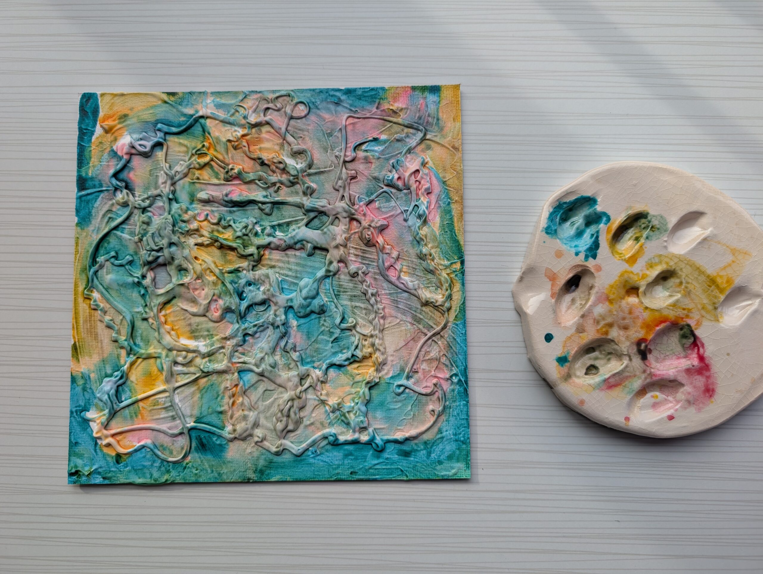 Victoria Riina’s first class at Severn Elementary School drew inspiration from Robert Weingarten’s large-scale photographs of artists’ palettes, featured in the exhibition Robert Weingarten: Palettes (on view from September 26, 2025- January 5, 2026). Each student designed and sculpted their own palette out of clay. Then, they used gesso and a variety of application techniques to build up texture on a canvas. Finally, students explored mixing watercolor paints on their palettes and adding them to the gesso base. Their palettes are works of art in their own right, equal to the finished canvases they produced.